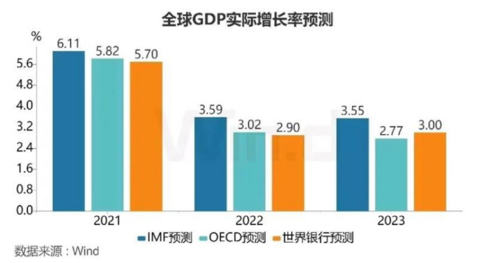 随着全球经济形势动荡加剧、战争和疫情影响持续传播,2022年6月9日,世界银行在最新一期《全球经济展望》中将2022年和2023年全球增速预测分别下调至2.9%、3%。今年4月份,IMF(国际货币基金组织)也将2022年和2023年全球增速的预测值分别下调至3.59%、3.55%。