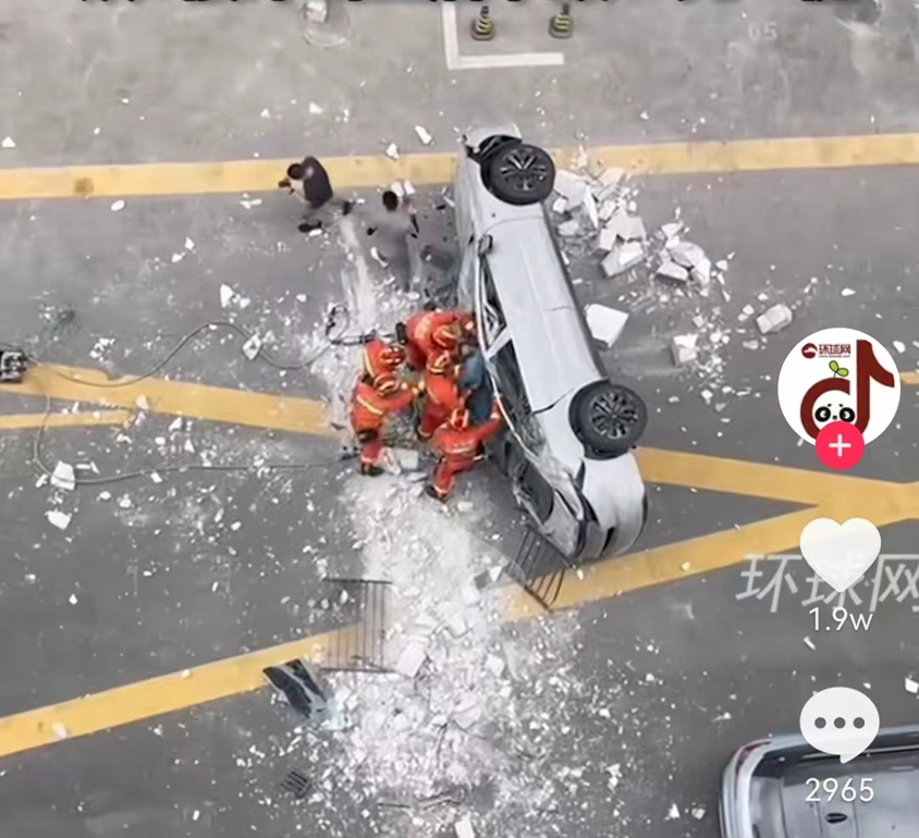 从视频画面来看,坠楼车辆疑似是一台蔚来ET7或ET5,坠地时侧车身着地,地上散落着破碎的玻璃和水泥碎块,车身也明显变形。现场有多名工作人员对车辆进行搬移,还有消防人员施救车内被困人员。