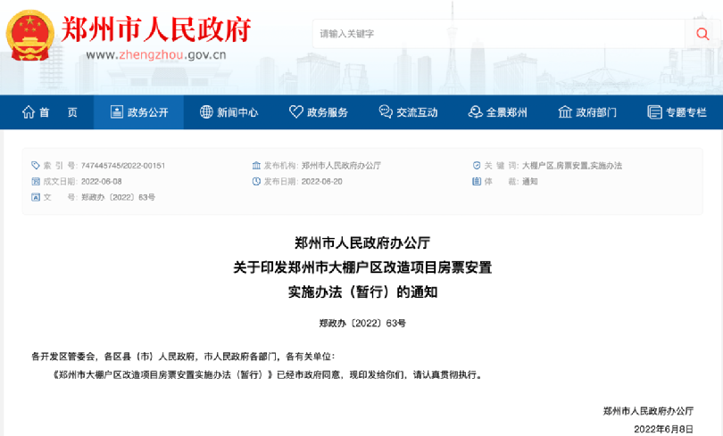 为了进一步加快新型城镇化建设,拓宽市大棚户区改造安置渠道,满足人民群众对安置房屋的多样化需求。6月20日,郑州市人民政府发布《郑州市大棚户区改造项目房票安置实施办法(暂行)》。本办法的适用范围为中心城区,即中原区、二七区、金水区、管城回族区、惠济区、郑东新区、郑州经开区、郑州高新区。