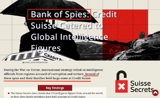 (爆料文件称瑞信是“间谍的银行”,并指恐怖组织的一些间谍和他们的家庭成员都在瑞信银行有账户 来源:OCCRP指控报道页面)