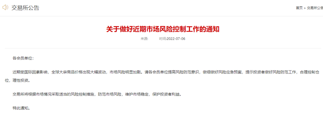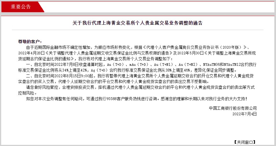 与此同时,工行还对贵金属业务交易保证金比例做出调整。自北京时间2022年7月8日收盘清算时起,Au(T+D)、mAu(T+D)、Au(T+N1)、Au(T+N2)、NYAuTN06和NYAuTN12合约工行标准交易保证金比例将从34%上调至42%,Ag(T+D)合约工行标准交易保证金比例从38%上调至46%,差异化保证金同步调整。
