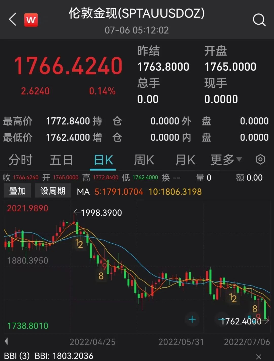 国际金价近期呈现快速下跌之势,7月5日,金价大跌,创19个月新低。7月6日,国际金价在触及2021年12月中旬以来新低至1762.93美元/盎司后温和反弹,但鉴于由于通胀处于数十年来的高位,全球央行年内不太可能停止收水,金价中期内继续看跌。