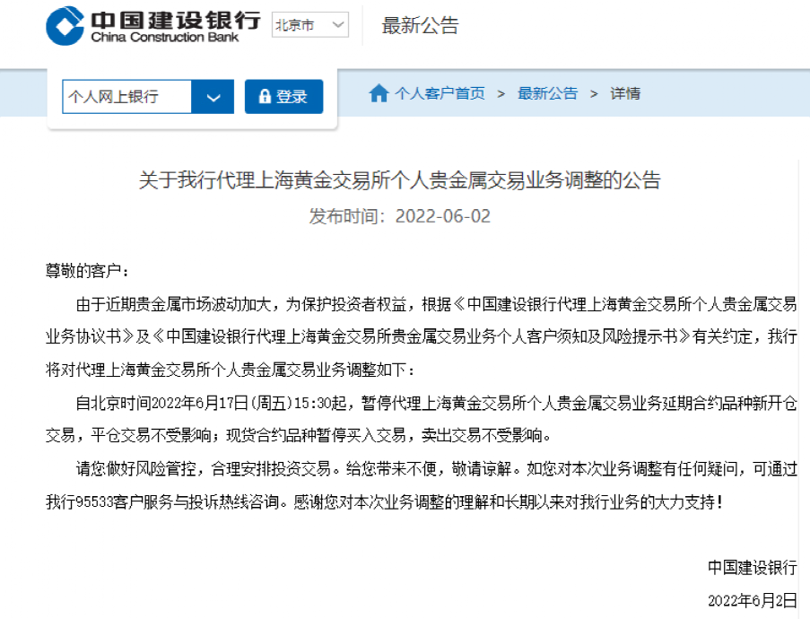6月2日,中国建设银行发布公告称,由于近期贵金属市场波动加大,为保护投资者权益,自北京时间2022年6月17日(周五)15:30起,暂停代理上海黄金交易所个人贵金属交易业务延期合约品种新开仓交易,平仓交易不受影响;现货合约品种暂停买入交易,卖出交易不受影响。