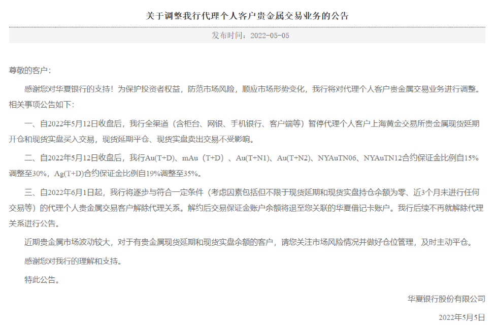 5月5日,华夏银行也发布关于调整我行代理个人客户贵金属交易业务的公告,公告称,2022年5月12日收盘后,华夏银行全渠道(含柜台、网银、手机银行、客户端等)暂停代理个人客户上海黄金交易所贵金属现货延期开仓和现货实盘买入交易,现货延期平仓、现货实盘卖出交易不受影响。同时上调贵金属交易保证金,自2022年5月12日收盘后,Au(T+D)、mAu(T+D)、Au(T+N1)、Au(T+N2)、NYAuTN06、NYAuTN12合约保证金比例自15%调整至30%,Ag(T+D)合约保证金比例自19%调整至35%。