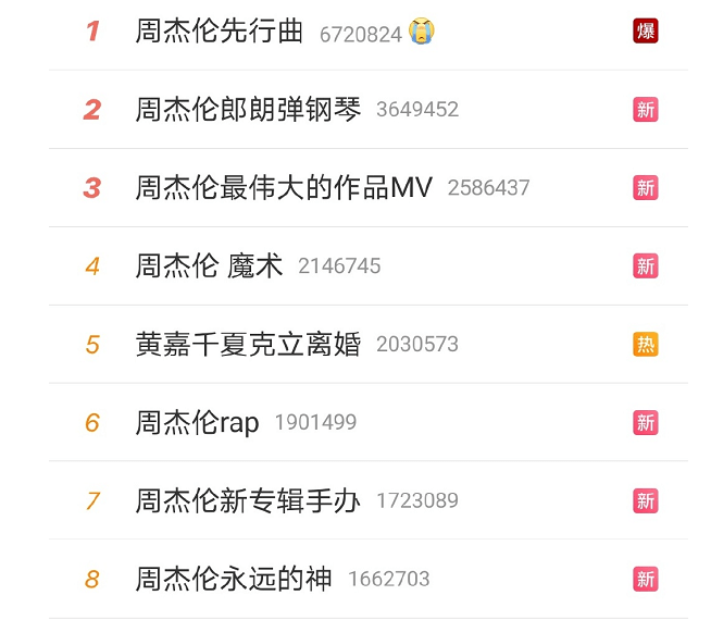 毫无意外,12点半左右,周杰伦新专辑相关话题都冲上了热搜。词条“周杰伦先行曲”甚至都爆了。网友惊呼:爷青回!还得是你。