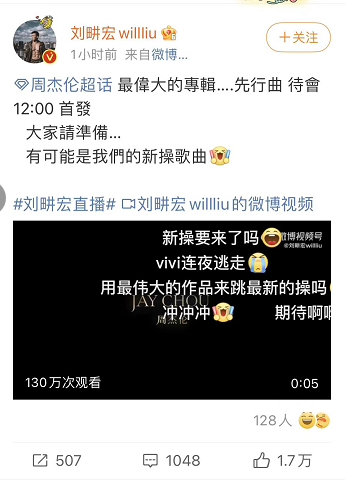 在新专辑发布前,近期直播跳操爆红的周杰伦好友——刘畊宏也发微博助阵,称这有可能是跳操的新曲。