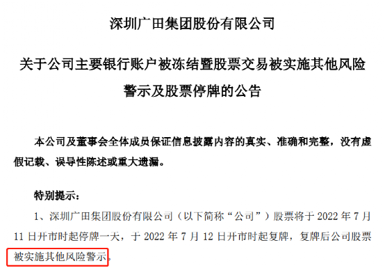 7月8日晚广田集团公告,将于2022年7月11日开市时起停牌一天,于2022年7月12日开市时起复牌,复牌后公司股票被实施其他风险警示,股票简称由“广田集团”变为“ST广田”,股票日涨跌幅限制变为5%。