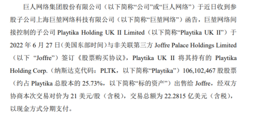 就在前不久,巨人网络发布公告称,公司间接参股子公司拟以每股21美元向Joffre Capital公司出售1.06亿股Playtika股票,约占后者总股本25.73%,交易总额为22.28亿美元。公司表示“本次交易可能对巨人网络利润带来重大正面影响”。