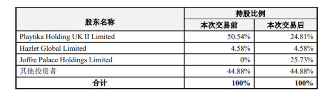本次股权转让过后,Playtika UK II的持股比例降至24.81%,失去控股权。不过根据巨人网络早前披露显示,Hazlet Global Limited的实控人为史玉柱之女史静,结合上述持股,史玉柱家族仍持有Playtika多数股权。