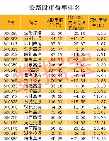 近半数公路股市盈率不足10倍