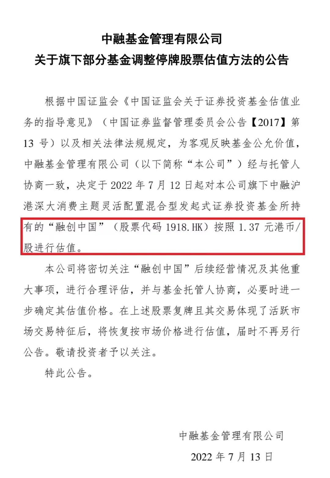 无独有偶,中融基金也在同一天公告,为客观反映基金公允价值,中融基金经与托管人协商一致,决定于2022年7月12日起对本公司旗下中融沪港深大消费主题灵活配置混合型发起式证券投资基金所持有的“融创中国”(股票代码1918.HK)按照1.37元港币/股进行估值。