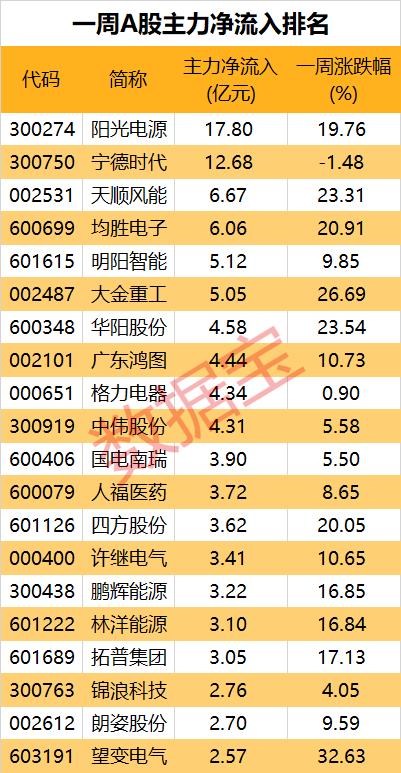 本周电力概念集体上涨,多股获主力资金大手笔抢筹;比亚迪遭主力抛售超30亿元。