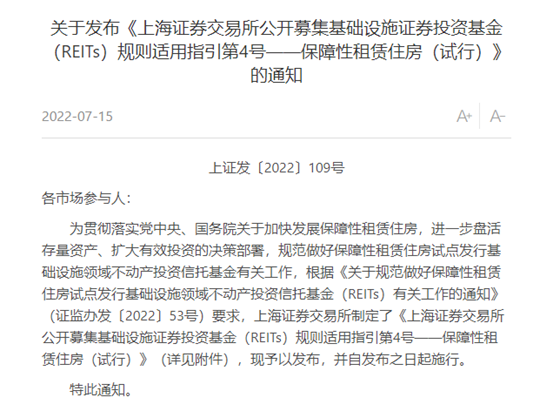 为贯彻落实党中央、国务院关于加快发展保障性租赁住房的决策部署,根据中国证监会、国家发展和改革委员会发布的相关工作通知要求,7月15日,沪深证券交易所发布并施行《上海证券交易所公开募集基础设施证券投资基金(REITs)规则适用指引第4号——保障性租赁住房(试行)》和《深圳证券交易所公开募集基础设施证券投资基金业务指引第4号——保障性租赁住房(试行)》,对保障性租赁住房试点发行基础设施REITs进行规范和引导。