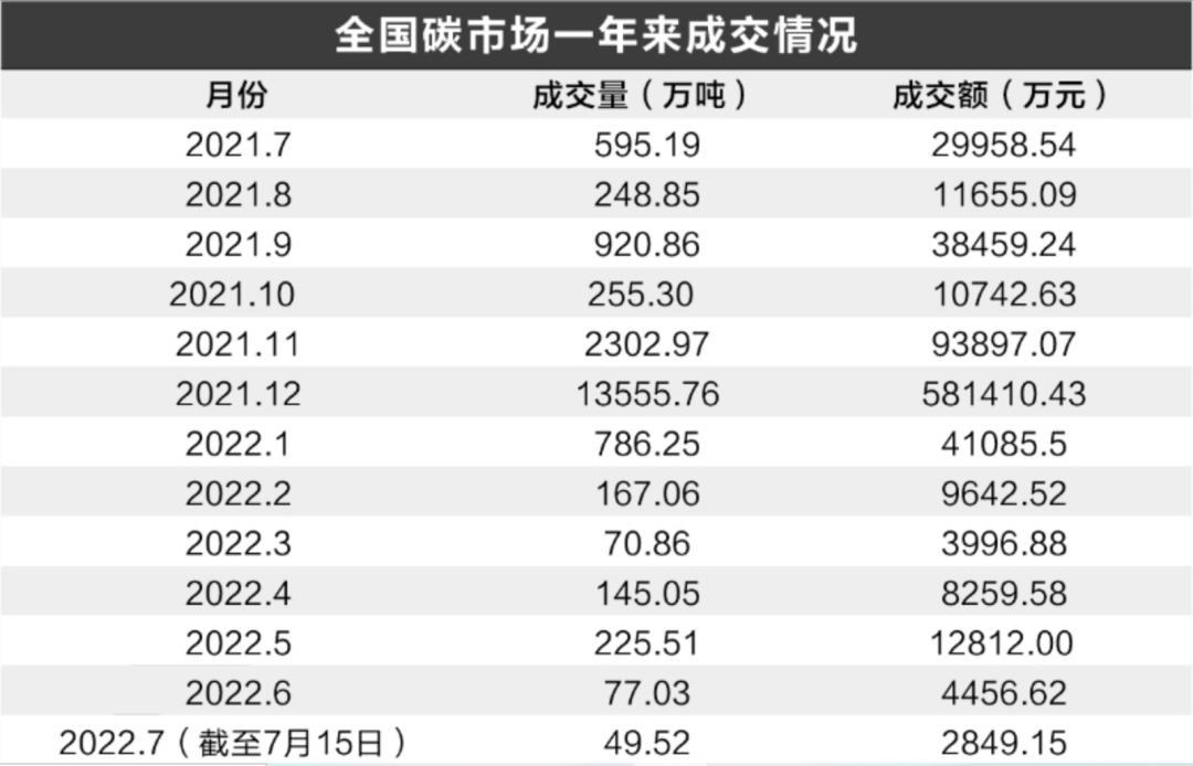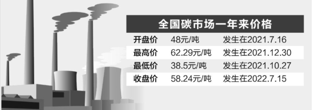 2021年7月16日,历经十年区域试点、四年筹备,全国碳市场以开盘价48元/吨拉开交易序幕。一年来,全国碳市场碳排放配额累计成交量1.94亿吨,累计成交额84.92亿元,期间最高价62.29元/吨,最低价38.50元/吨,最新收盘价为58.24元/吨。