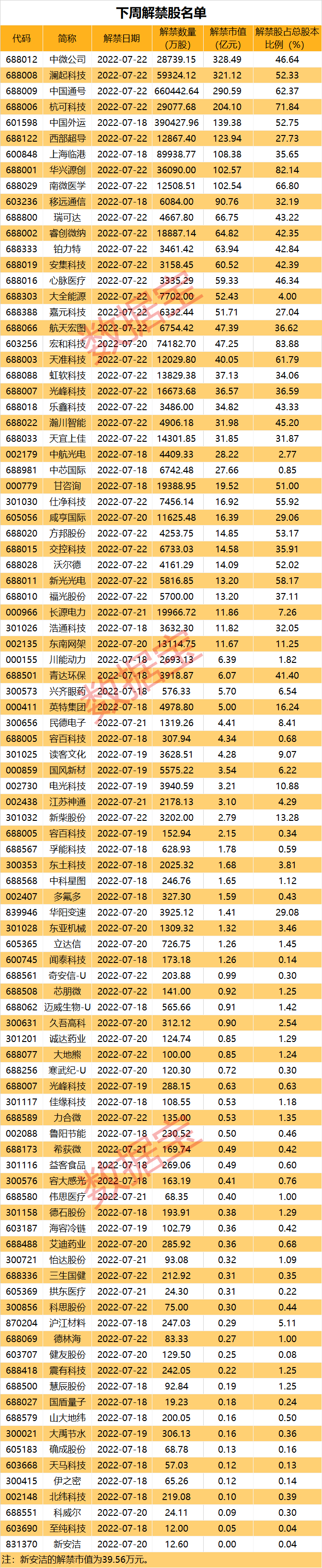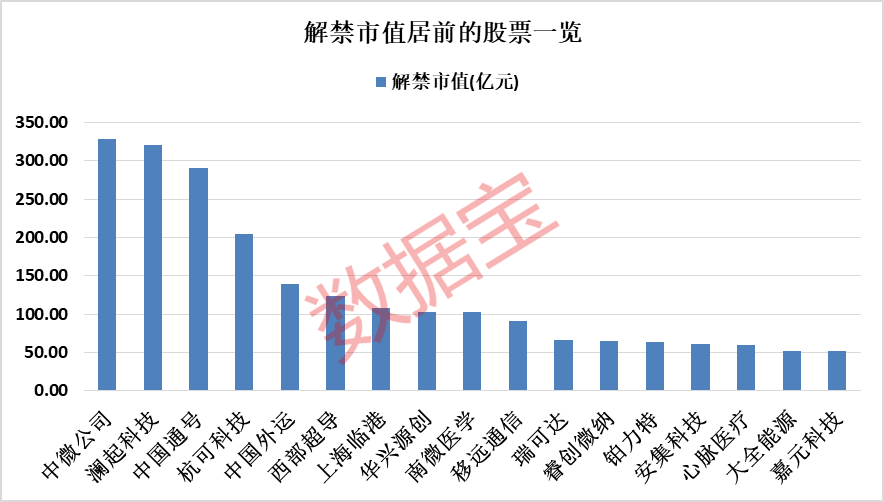 数据宝统计,多家公司解禁时间集中在7月22日,包括中微公司、澜起科技、中国通号、杭可科技、西部超导、华兴源创、南微医学,且解禁市值均超百亿元。