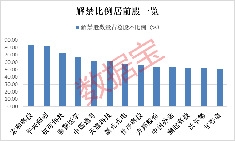 数据宝统计,共有13股解禁股数量占总股本比例超过50%,包括宏和科技、华兴源创、杭可科技、南微医学等。