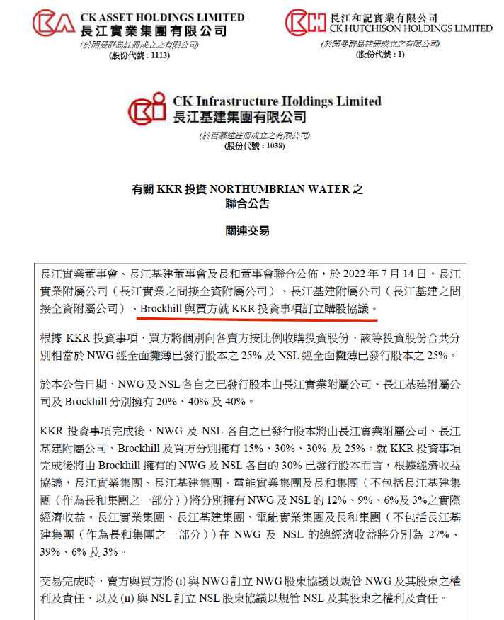 李嘉诚家族旗下的“长和系”的长江和记(长和)、长江实业集团(长实)及长江基建集团于7月14日晚间联合发布公告称,美国私募股权基金巨头KKR将入股李氏家族持有的英国水务公司Northumbrian Water项目25%股权,当中基本代价为8.67亿英镑(约80.73亿港元)。