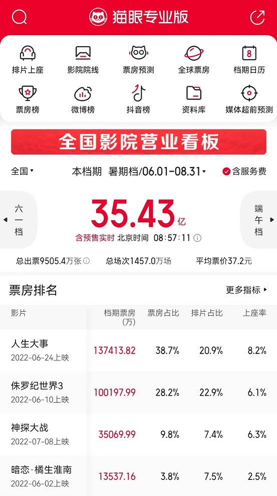 猫眼专业版数据显示,截至7月17日,今年暑期档总票房(含预售)已突破35亿元。而在上周六,全国总场次数突破37万,也已经恢复至去年同期的94%,大部分城市的营业率基本恢复到去年同期水平。
