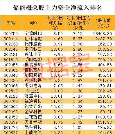 数据宝统计,截至最新收盘,储能概念股A股市值合计8万亿。主力资金今日大幅流入储能板块,净流入额达到40.94亿元。20股主力净流入超亿元,包括宁德时代、亿纬锂能、拓邦股份、中核钛白、科陆电子等。宁德时代净流入额7.12亿元排在首位,该股今日上涨3.5%。