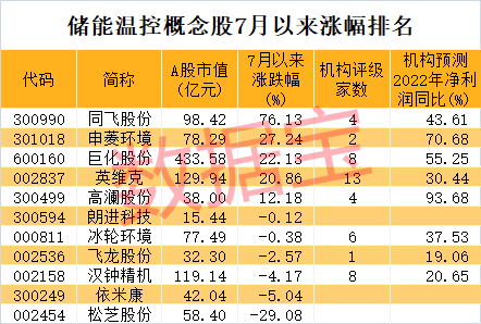 数据宝统计,上市公司中布局温控领域的较少,截至7月18日收盘,这些概念股合计A股市值不足1200亿元。7月以来部分概念股已出现明显上涨,包括同飞股份、申菱环境、巨化股份、英维克等累计涨幅超过20%。