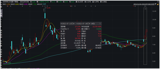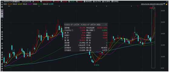 贵绳股份方面,公司实控人为贵州省国资委。主要从事钢丝、钢绳产品及相关设备、材料、技术的研究、生产、销售及进出口业务,从业绩上来看,公司2021年实现营收25.29亿元,同比增长18.74%;归母净利润为3103.17万元,同比增长2.8%。一季度数据显示,期内公司实现营入5.07亿元,同比增长19.31%;净利润499.67万元,同比增长16.21%。股价方面,公司股价近4个交易日大涨近40%,其中收获3个涨停。
