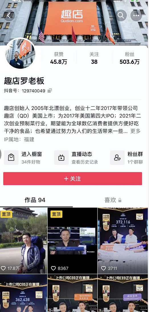 在账号的自我介绍中,罗敏写道,自己“2005年北漂创业,2017年带领趣店美国上市,2021年二次创业预制菜行业”。至于为什么进军这个行业,罗敏称,“因为它能真正帮助到数以万计的农民、渔民、牧民。用互联网去帮他们打开销路。”