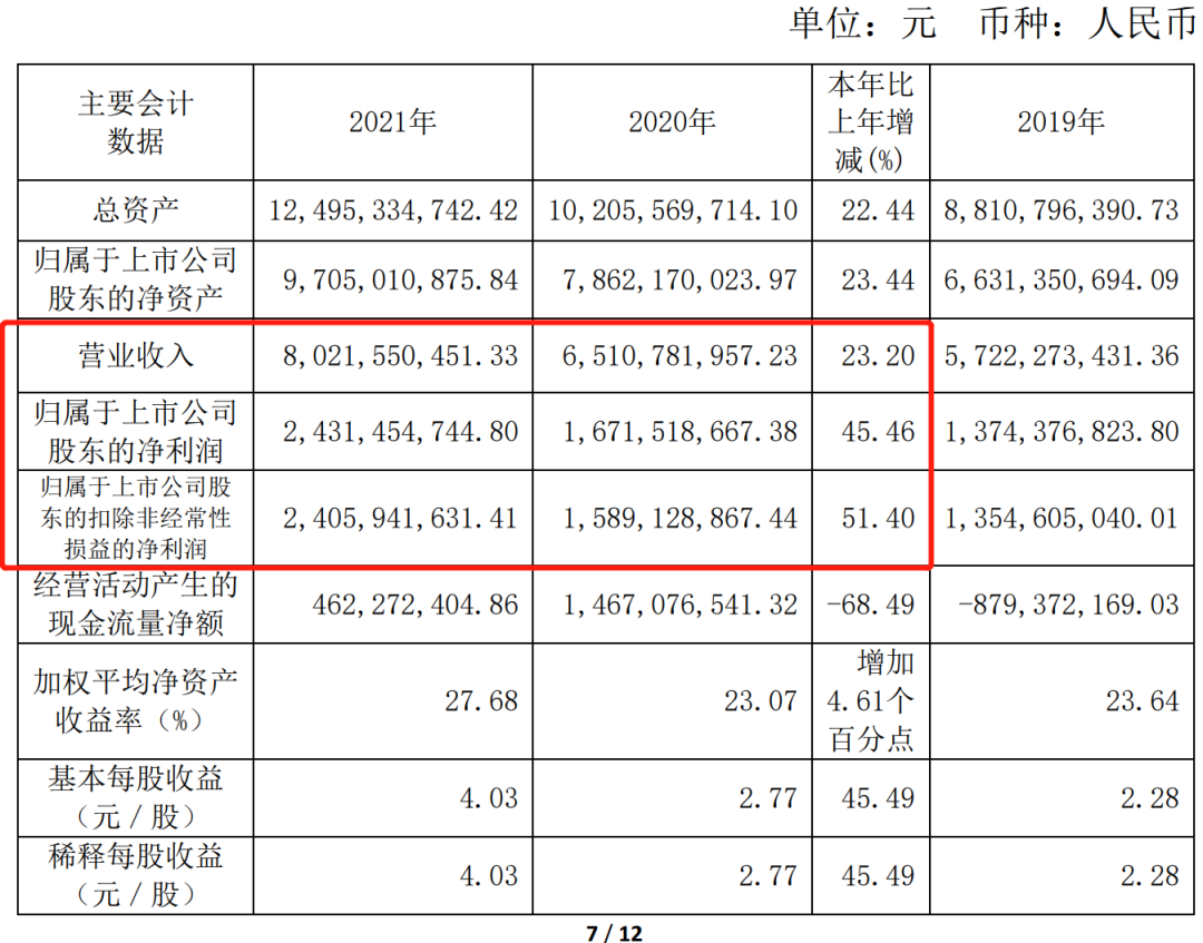 据公司财报,2021年片仔癀实现营业收入80.22亿元,同比增长23.2%;实现净利润24.31亿元,同比增长45.46%。其中,2021年该公司医药制造业收入39.72亿元,同比增长达45.39%。