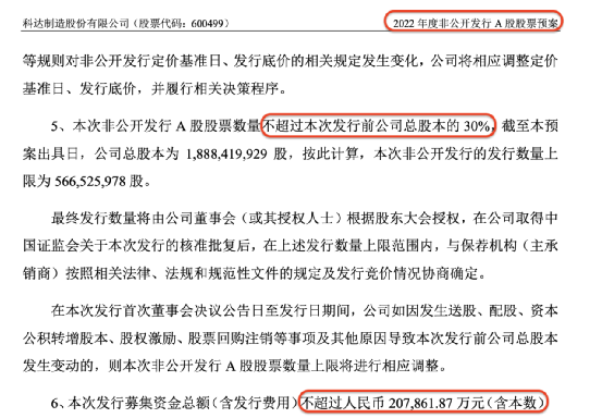 2022年3月30日,科达制造通过了《关于公司2022年度非公开发行A股股票方案的议案》《关于公司<2022年度非公开发行A股股票预案>的议案》等与公司2022年度非公开发行A股股票事项相关的议案,拟非公开发行A股股票数量不超过发行前公司总股本的30%,募集资金总额(含发行费用)不超过人民币207,861.87万元。