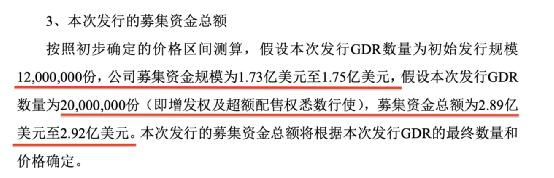 假设本次发行GDR数量为初始发行规模12,000,000份,公司募集资金规模为1.73亿美元至1.75亿美元;假设本次发行GDR数量为20,000,000份(即增发权及超额配售权悉数行使),募集资金总额为2.89亿美元至2.92亿美元。