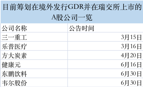 除此之外,三一重工、乐普医疗、方大炭素、健康园、东鹏饮料和韦尔股份自3月份开始,也陆续发布公告,筹划在境外发行GDR并在瑞交所上市。
