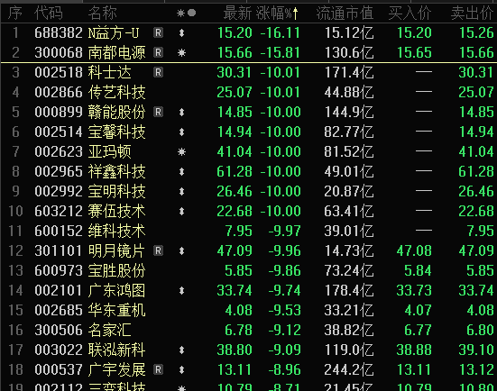 早盘下跌股数量居多,创业板股南都电源跌幅超过10%,祥鑫科技、赣能股份、亚玛顿、宝馨科技、科士达、维科技术等高位股先后闪崩跌停。祥鑫科技涉及储能等热门概念,是精密冲压模具和金属结构件一体化解决方案提供商,其上一日涨停,股价创历史新高。赣能股份涉及绿色发电概念,上一日同样创阶段新高,公司股价曾连续9个涨停板,上周五,深交所通报,对近期涨幅异常的“中通客车”“赣能股份”进行重点监控。截至午间收盘,赣能股份跌停封单超过32万手。