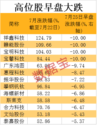不难发现,上述跌停股近日的收盘价均处于历史(阶段)高位,闪崩的并非这几只。证券时报·数据宝统计,早盘高位股跌幅超过8%以上的还有明月镜片、广东鸿图、传艺科技等,这些公司7月份均积累较高涨幅。截至午间收盘,月内涨幅超过50%的35股今日早盘平均下跌近3%。
