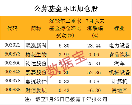 以上6只获基金环比加仓股7月平均上涨17.25%,泰嘉股份涨幅居首,超过50%,钧达股份、联泓新科同期涨幅均超过25%,财信发展跌幅超过6.5%,梅花生物同期涨幅不到1%。