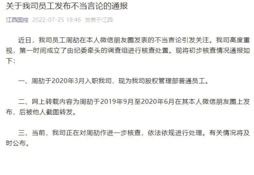 7月25日,江西省国有资本运营控股集团有限公司在其微信公众号上通报,近日,我司员工周劼在本人微信朋友圈发表的不当言论引发关注。我司高度重视,第一时间成立了由纪委牵头的调查组进行核查处置。现将初步核查情况通报如下:
