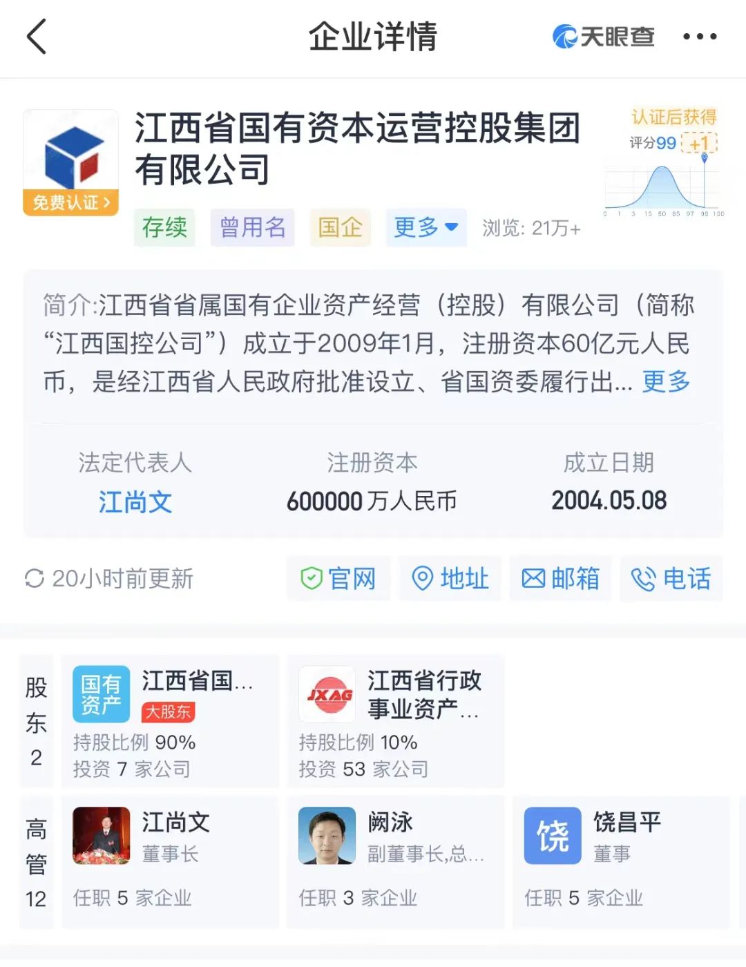 天眼查显示,江西省国有资本运营控股集团有限公司注册资本60亿,江西省国资委持有江西国控集团90%的股份;江西省行政事业资产集团有限公司持股10%。