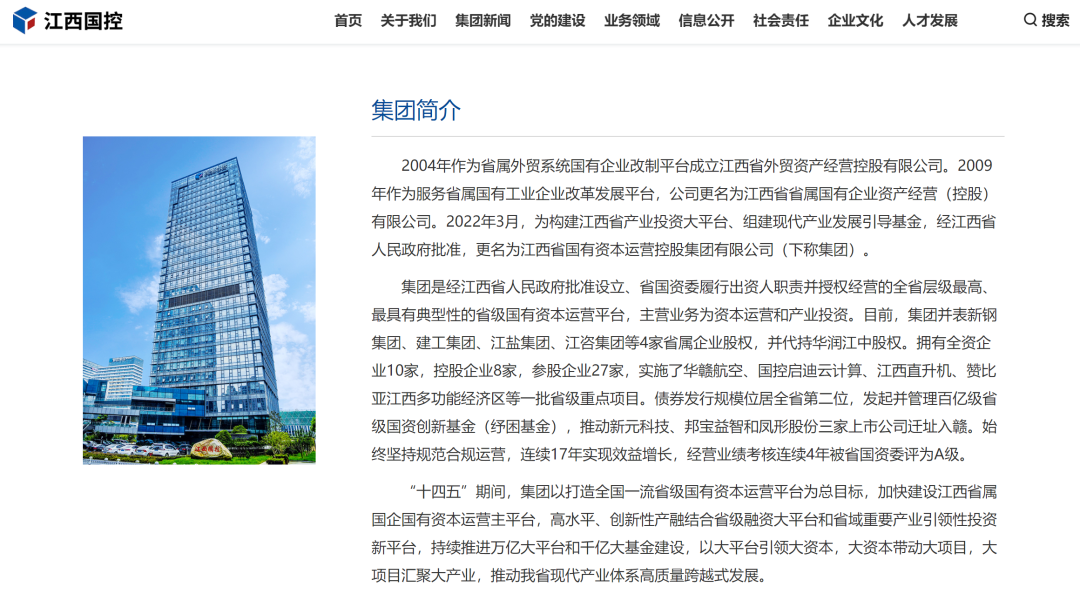 江西国控集团官网集团简介显示,集团是经江西省人民政府批准设立、省国资委履行出资人职责并授权经营的全省层级最高、最具有典型性的省级国有资本运营平台,主营业务为资本运营和产业投资。