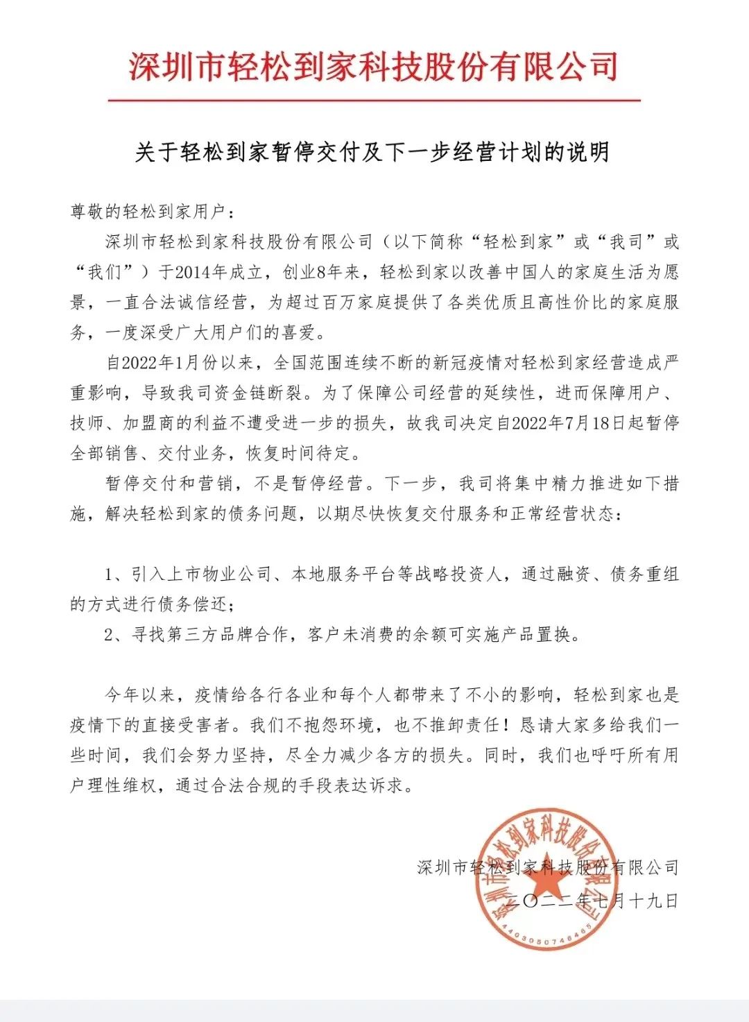 近日,深圳市轻松到家科技股份有限公司(简称“轻松到家”)宣布,因资金链断裂,决定7月18日起暂停全部销售、交付业务,恢复时间待定。