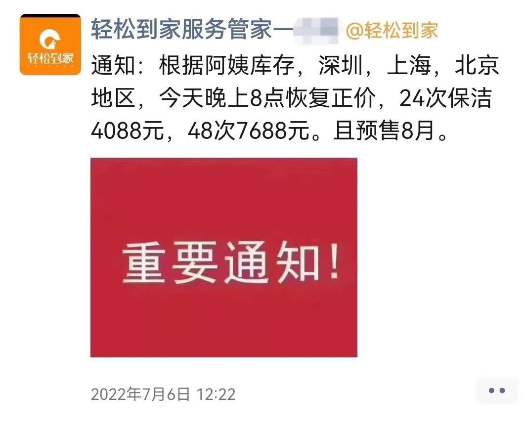 记者在轻松到家一位服务管家的社交平台看到,7月1日,轻松到家发布6月交付量近16万单的喜报。7月6日,该服务管家发消息称,根据阿姨库存,深圳、上海、北京地区,当晚8点恢复正价,24次保洁4088元。