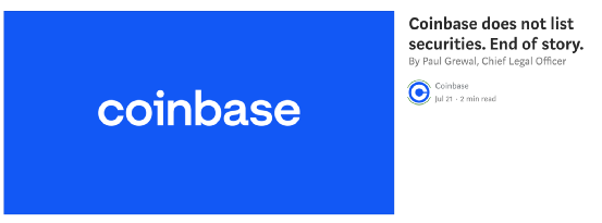 Coinbase对“部分加密资产实际上为证券”这一判断,持反对态度。7月21日,Coinbase在自己的博客上表示“Coinbase不上市证券。故事结束。”