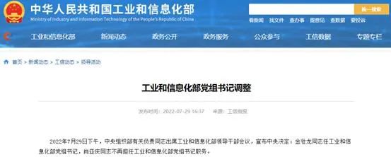 据工信部网站消息,2022年7月29日下午,中央组织部有关负责同志出席工业和信息化部领导干部会议,宣布中央决定:金壮龙同志任工业和信息化部党组书记,肖亚庆同志不再担任工业和信息化部党组书记职务。