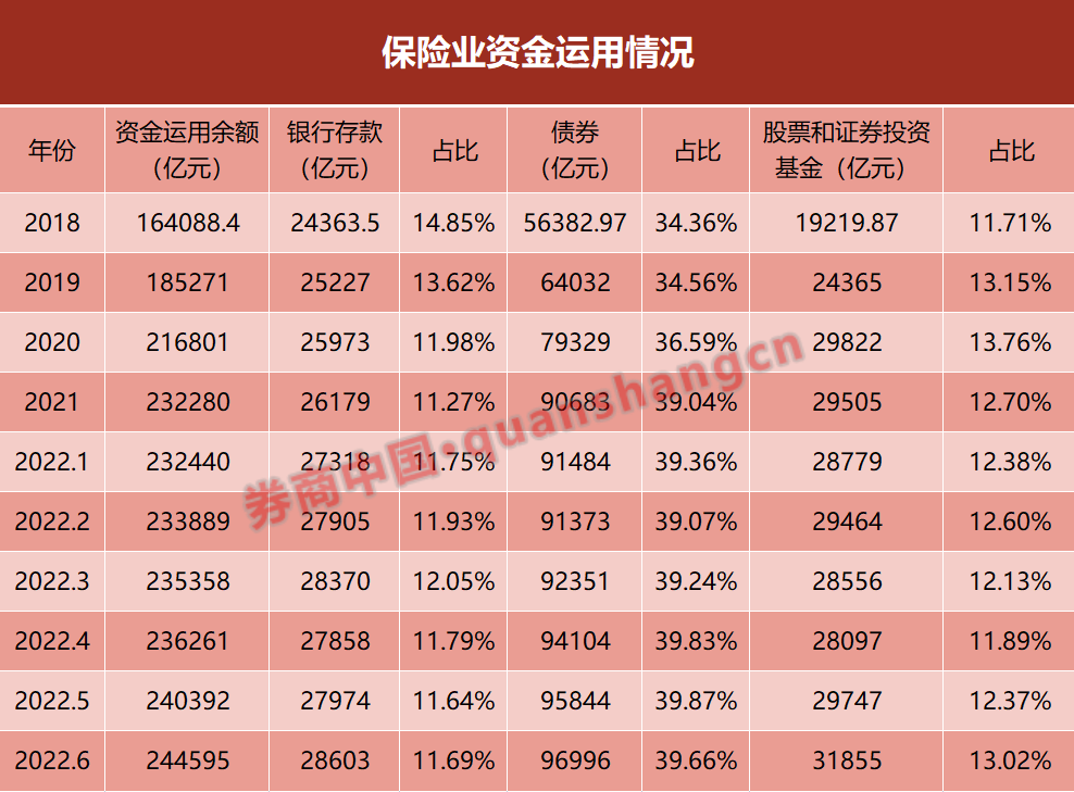 6月末,保险资金运用余额达到24.46万亿元。其中,银行存款2.86万亿元,占比11.69%;债券类投资为9.7万亿元,占比39.66%;投资于股票和证券投资基金的资金运用余额为3.19万亿元,首次突破3万亿元,占比13.02%,不仅达到今年以来最高点,也明显高于2021年末的占比水平。