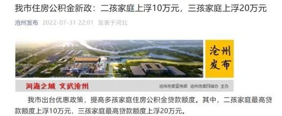7月31日,“沧州发布”微信公众号发布消息,沧州市出台优惠政策,提高多孩家庭住房公积金贷款额度。其中,二孩家庭最高贷款额度上浮10万元,三孩家庭最高贷款额度上浮20万元。