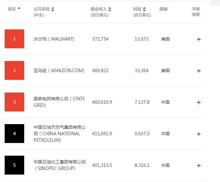 此外,亚马逊上升至第二位,中国的国家电网公司位居第三位。中石油、中石化分别位居第四、第五位。