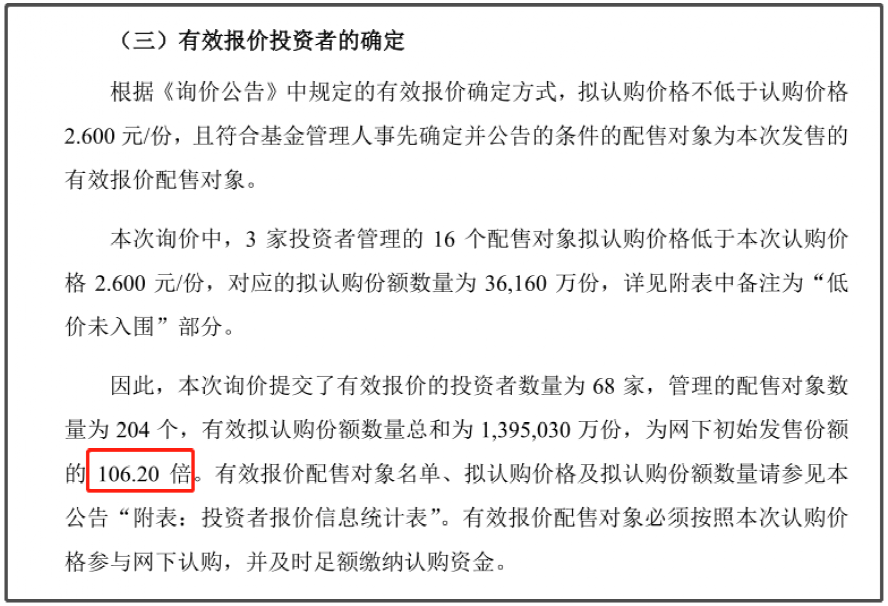 从公告信息看,总体来看,中金厦门安居REIT共收到69家网下投资者管理的220个配售对象的询价报价信息。拟认购基金份额总量143.12亿份,为网下初始发售份额数量的108.96 倍。报价区间为2.485元/份-2.695元/份,剔除不符合条件的报价后,所有网下投资者剩余报价的中位数为2.695 元/份,报价加权平均数为2.6856元/份。本次询价中,3家投资者管理的16个配售对象拟认购价格低于本次认购价格2.6元/份,对应的拟认购份额数量为36,160 万份。因此,本次询价提交了有效报价的投资者数量为68家,管理的配售对象数量为204个,有效拟认购份额数量总和为139.5亿份,为网下初始发售份额的106.20倍。