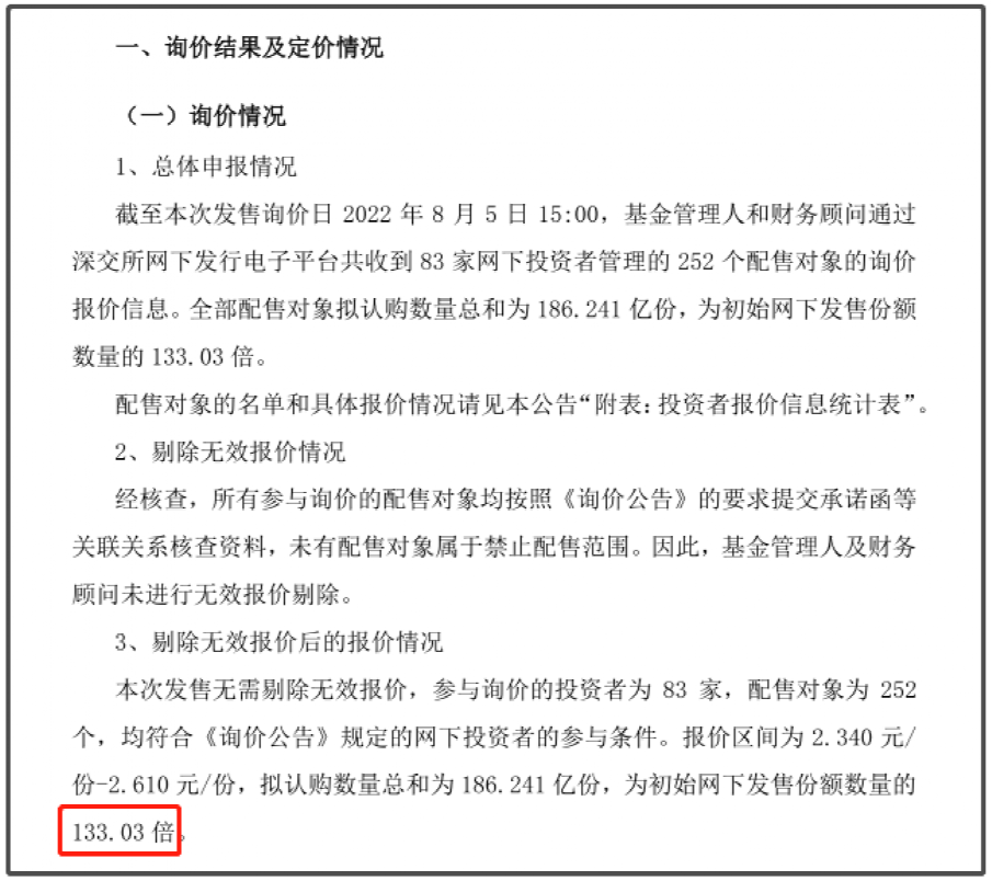 同时,红土深圳安居REIT公告,共收到83家网下投资者管理的252个配售对象的询价报价信息。全部配售对象拟认购数量总和为186.24亿份,为初始网下发售份额数量的133.03倍。报价区间为2.340 元/份-2.610元/份,本次发售无需剔除无效报价,所有网下投资者报价的中位数为2.61元/份,加权平均数为2.6元/份。