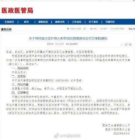 8月9日,国家卫健委发布《关于将阿兹夫定片纳入新型冠状病毒肺炎诊疗方案的通知》。通知提到,根据国家药监局附条件批准阿兹夫定片增加治疗新型冠状病毒肺炎适应证注册申请的审批意见,为进一步完善新型冠状病毒肺炎抗病毒治疗方案,经研究,将该药纳入《新型冠状病毒肺炎诊疗方案(第九版)》。