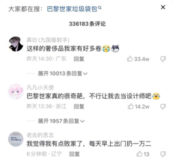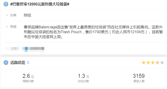 #巴黎世家12000元新包像大垃圾袋#等相关话题在微博、抖音上拥有很高的热度。截至发稿,微博该话题阅读量高达2.6亿。
