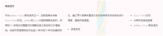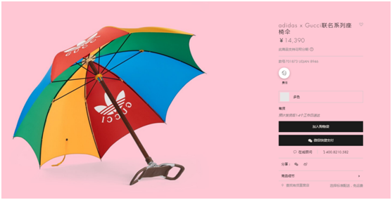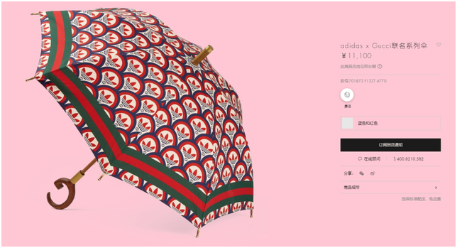 另外,今年Gucci与 adidas 曾推出了一个联名系列 adidas x Gucci,其中一款售价 11000 元的雨伞,吸引了大家的注意。伞柄处为定制的 G 字造型,是 Gucci 品牌的标志,伞面是这次联名的合作印花。