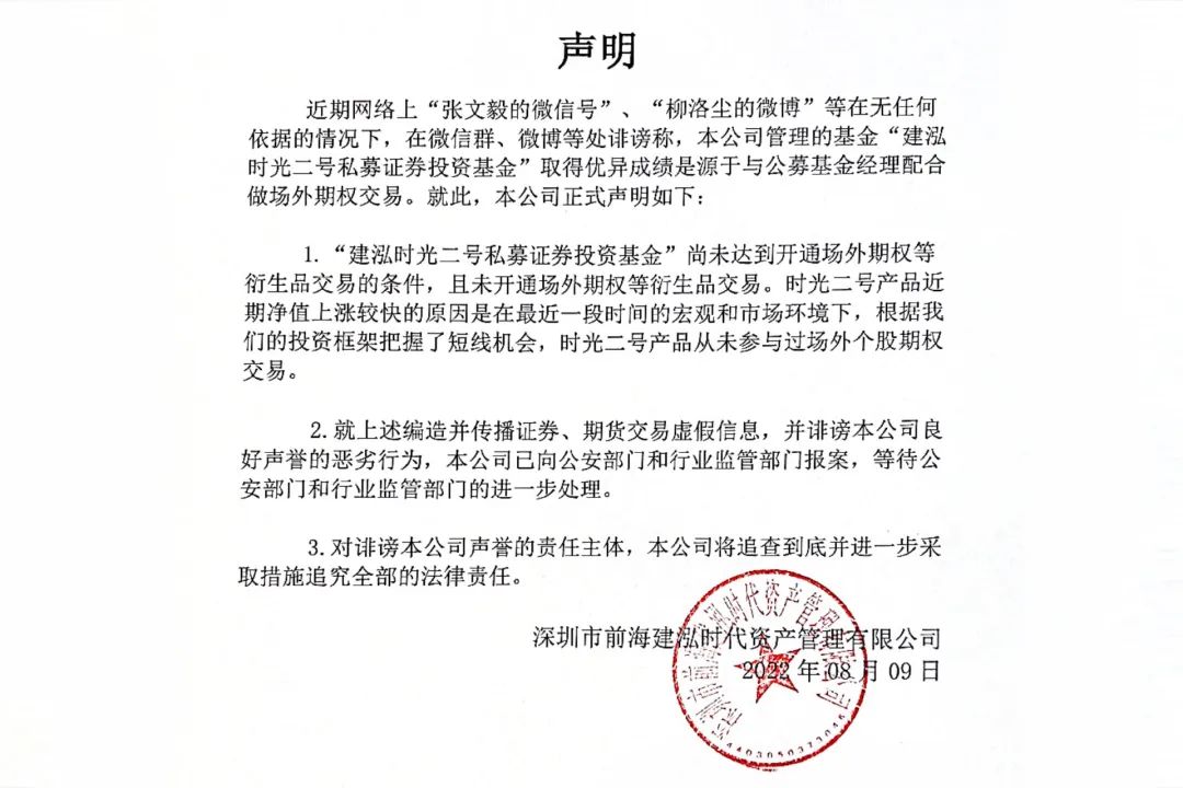 8月9日晚间,深圳市前海建泓时代资产管理有限公司官网发布声明表示,时光二号从未参与场外个股期权交易。