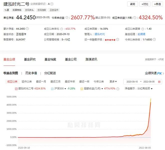 私募排排网近日数据显示,建泓时代旗下产品 “建泓时光二号”于2020年9月成立,不过截至8月5日,产品单位净值已高达44.245,不到2年时间涨幅超43倍。尤其是7月以来,该产品每周收益率均超20%,甚至最高达93.5%!